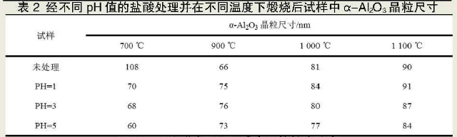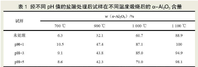 -研究者采用以下4個(gè)步驟制備煅燒氧化鋁粉體:采用球磨機(jī)對(duì)工業(yè)氧化鋁進(jìn)行球磨,球、料質(zhì)量比為4:1,球磨時(shí)間2h;采用去離子水將濃的分析純鹽酸稀釋成pH值分別為1、3和5的鹽酸溶液;用量筒分別量取300mL不同pH值的鹽酸溶液,再分別向其中加入5g球磨后的工業(yè)氧化鋁粉,并在磁力攪拌器攪拌1h,然后將所得的乳濁液進(jìn)行抽濾處理,得到白色沉淀物(即氧化鋁水化物),再將沉淀物重復(fù)上述處理過(guò)程3次。將最終得到的白色沉淀(氧化鋁水化物)在110℃干燥12h~24h,然后將這3種經(jīng)酸處理的工業(yè)氧化鋁和未經(jīng)酸處理的工業(yè)氧化鋁分別于700℃、900℃、1000℃和1100℃保溫3h煅燒。
