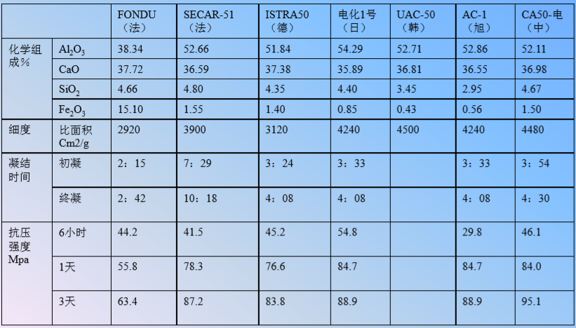 用熔融法生產(chǎn)的高鐵純鋁酸鈣水泥或低鐵純鋁酸鈣水泥,其特點是優(yōu)良的流動性和早強(qiáng)性。已 廣泛用于1250℃以下的耐火澆注料,在日本、韓國、中國,用電弧爐熔融法也生產(chǎn)類似產(chǎn)品, 性能也很優(yōu)秀。圖三為市場上幾種熔融法純鋁酸鈣水泥廠家的性能。