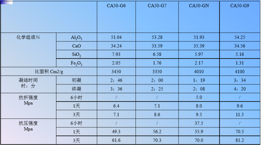 為了加快純鋁酸鈣水泥耐火澆注料的硬化速度,縮短澆注料的養(yǎng)護(hù)時間,希望純鋁酸鈣水泥具有更早發(fā)揮強(qiáng)度的性能。為了降低澆注料中的純鋁酸鈣水泥組成用量,希望鋁酸鈣水泥具有優(yōu)良的水化活性和高的強(qiáng)度。誕生了早強(qiáng)型純鋁酸鈣水泥CA-50N和高強(qiáng)型純鋁酸鈣水泥CA-50G9。 這兩種水泥需要特別優(yōu)選原料,嚴(yán)格控制工藝過程和成分范圍。其主要的性能指標(biāo)見下面的圖2。